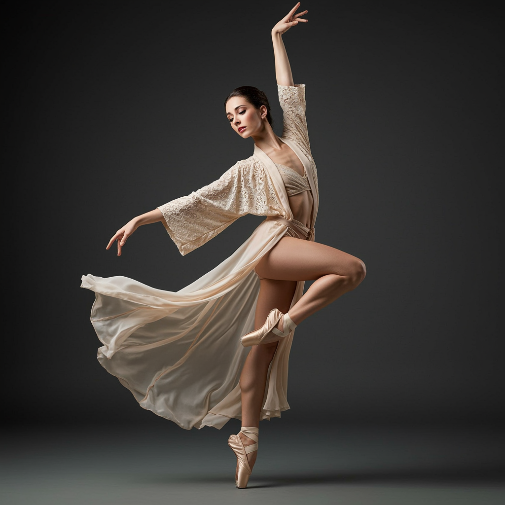 A full-color photograph captures a brunette with hair elegantly styled in a bun, embodying the grace of a professional ballet dancer. She is adorned in a delicately designed translucent lace ensemble, accentuated by a minimally styled Japanese-inspired mini kimono. Her eyes are captivating, conveying depth and emotion as her hands express the fluidity of her dance. Her entire form is visible in the image as she performs a soft, classical ballet routine, epitomizing free body expression. Clad in ballet pointe shoes, her movements epitomize a style reminiscent of David Hamilton, characterized by a loose, fluid aesthetic that captures the essence of motion and grace.