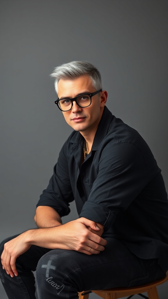 View this AI-generated image featuring photograph of a male fashion model seated on a chair showcasing a silver undercut hairstyle and wearing black horn rimmed glasses the model has a partially shaven face and is dressed in a black loose fit shirt with rolled up sleeves revealing a medium gothic cr