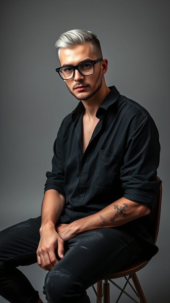 Photograph featuring a male fashion model seated on a chair, showcasing a confident demeanor with a silver undercut hairstyle and black horn-rimmed glasses. His face is clean-shaven, adding to the sleek and modern look. He wears a loose-fitting black shirt with rolled-up sleeves, revealing a medium gothic design cross tattoo along with lettering on his arm. The ensemble is completed by dyed black denim pants. Captured in the style of Richard Avedon using a Sony α9 II with a Sony FE 100-400mm f/4.5-5.6 GM OSS lens, the model is set against a solid grey background in a photo studio. There is a focus on high contrast and highlighted lighting effects, bringing out the details in a realistic, engaging photograph. The model gazes confidently into the camera, creating a connection with the viewer. This image avoids unfinished forms, awkward poses, strange tags, logos, typographical errors, multiple limbs, surreal elements, unfocused eyes, monochrome effects, and sunglasses, maintaining artistic integrity and realism.