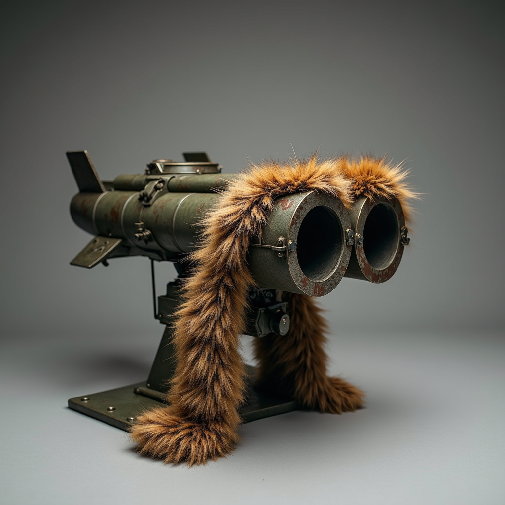 A captivating photograph of an art piece featuring an antitank rocket launcher adorned with leopard fur. The imposing BGM 71 TOW missile launcher is transformed into a striking artistic creation, blending tough metal with soft animal skin. Displayed in a professional photography studio, the setup utilizes a neutral grey background to highlight the launcher. The composition offers a compelling contrast between the rigid form of the weapon and the delicate texture of the fur. Illuminated with professional studio lighting including softbox and subtle bokeh effects, the camera captures the scene from a 45-degree angle in a close-up shot. Using a 35mm lens with ISO 100, low shutter speed, and aperture set at f4, the image exemplifies high-quality digital photography suitable for a premium stock photo.