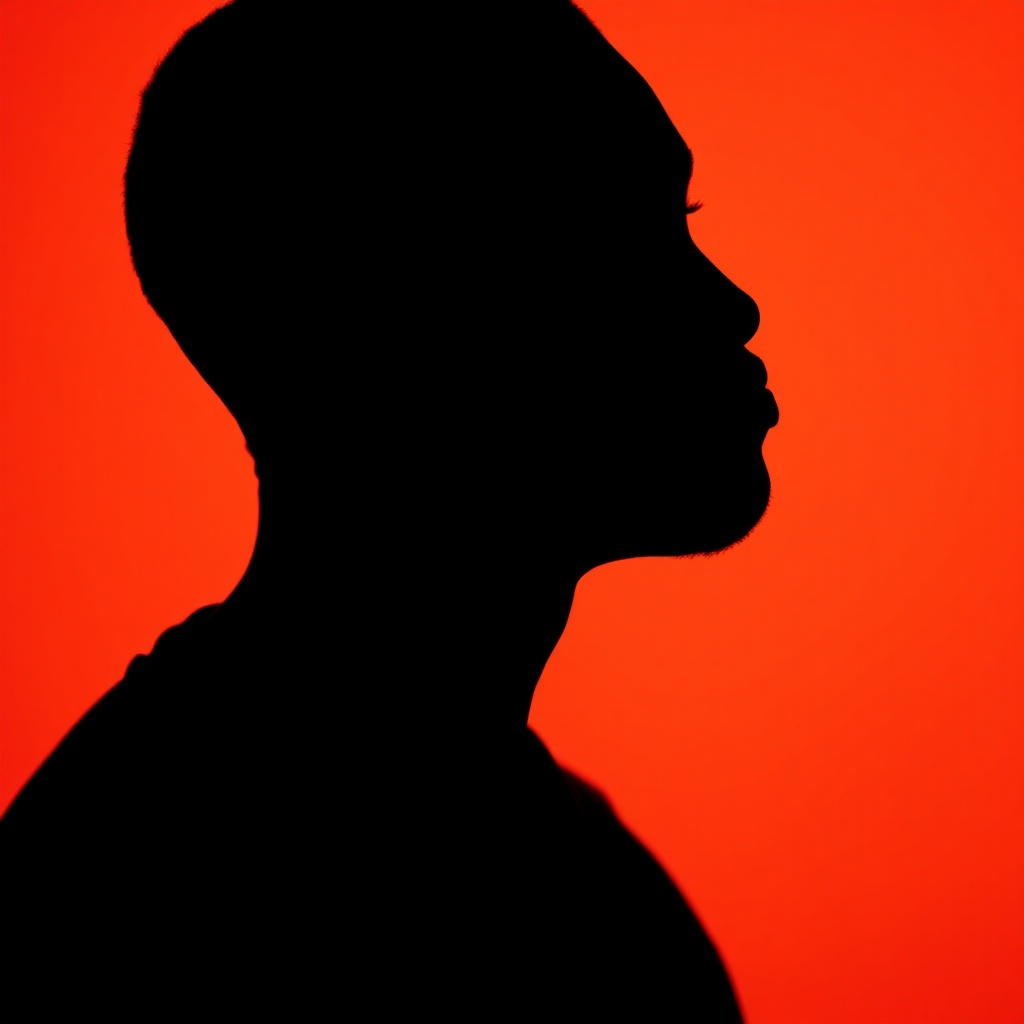 Photography, striking portrait of contrast featuring the profile silhouette of a black man against a vivid orange backdrop. The scene is captured with a camera setup that mimics a wide aperture, emphasizing the sharp outline of the silhouette's edge, while a low ISO ensures the preservation of rich, smooth colors devoid of grain. The image is photorealistic and ultra-high definition, with an aspect ratio of 9:16, exuding a sense of controlled raw energy and subtle creative variations.