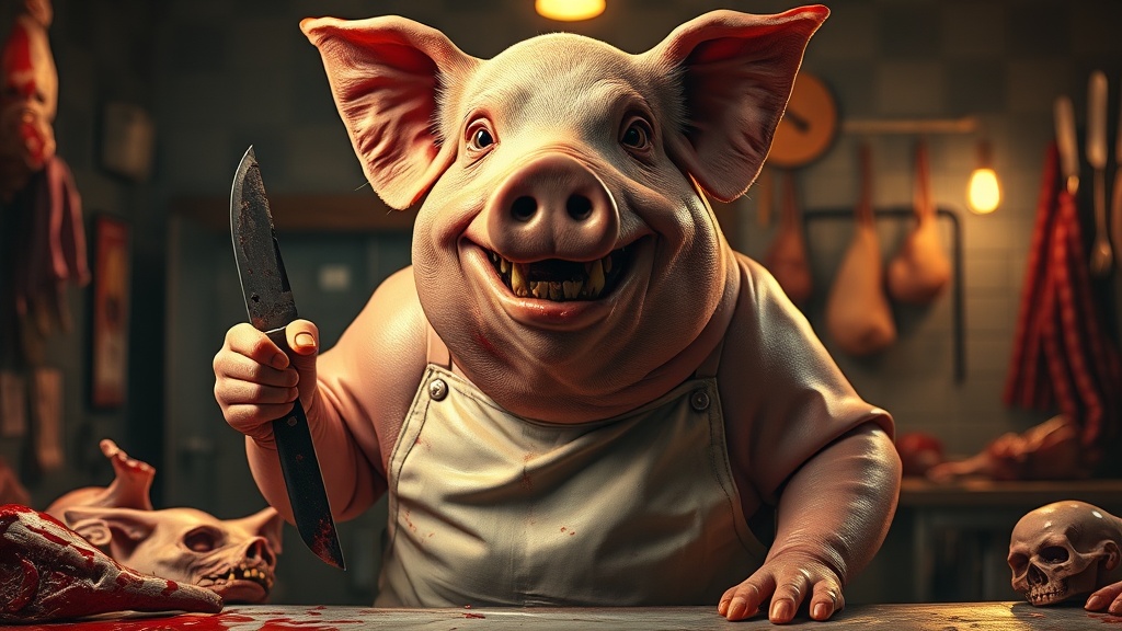 A corpulent pig in a butcher's apron stands at a counter with a chillingly sinister smile and broken teeth, staring into the camera. Its glistening skin shines under warm, dramatic lighting, invoking a hyperrealistic, photographic style. Around the pig, human parts are conspicuously displayed, while it brandishes a bloody butcher's knife. The scene is rich with dramatic and vivid colors, showcasing a highly detailed, 8k quality imagery, akin to artwork trending on ArtStation. The pig's clothing is stained with blood, adding to the eerie atmosphere. Despite the photographic realism, the anatomy is slightly off—a long neck and body, unusual and skewed eyes, and conjoined fingers add to its unsettling charm. Small creative deviations include collapsed eyeshadow and multiple eyebrows, with a peculiar, unnatural face and imperfect body features. The image carries an underlying error in its composition, discovered in the oversaturation and bizarre anatomical quirks, ensuring its surreal nature remains intact.