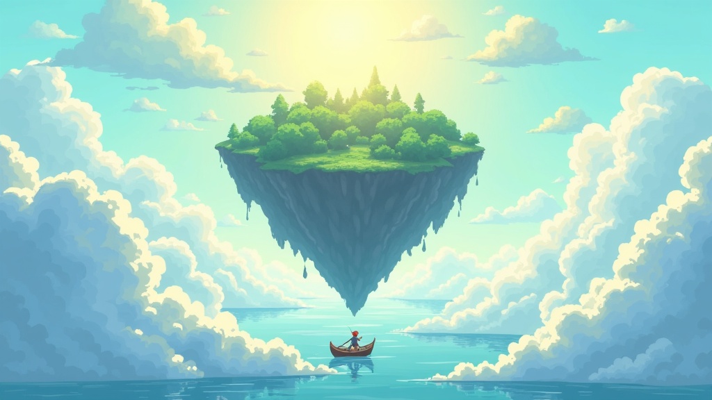 View this AI-generated image featuring a 16 bit pixel art masterpiece depicting an explorer in a small wooden boat sailing towards a fantastical floating island amidst the clouds capturing the whimsical essence of studio ghibli the scene is a sweeping cinematic still with vivid hdr colors where fluf