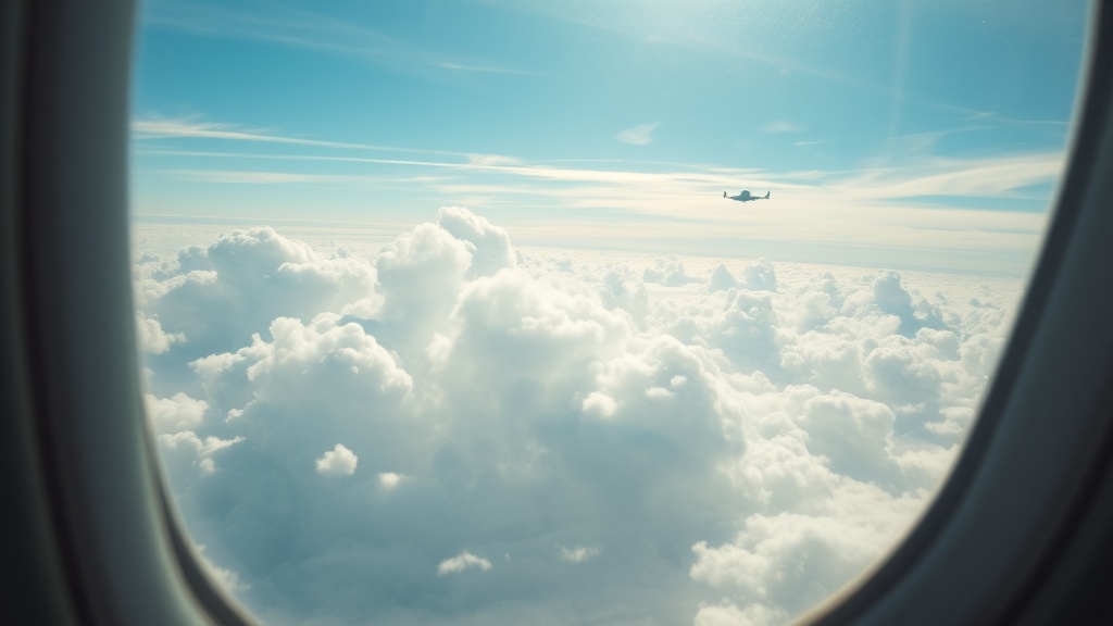 From within the cabin of a passenger plane, a panoramic vista unfolds as white, fluffy clouds drift lazily across the azure sky, while through the window, a mysterious UFO hovers in the distance, casting a shimmering reflection of sunlight as it dances between the wisps of cloud.