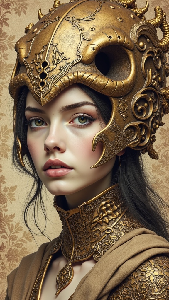 A captivating portrait of a woman adorned with a skull helmet, inspired by the detailed style of Pinturicchio and the ornamental richness of dragon art. The artwork features intricate, engraved line-work, reminiscent of Jessie Arms Botke, with a harmonious blend of light bronze and deeper bronze hues. Her expression is serene yet powerful, set against a background of large-scale ornate patterns, invoking a sense of timeless elegance. The composition emphasizes a balance between classical art techniques and imaginative, fantastical elements, capturing both beauty and strength.