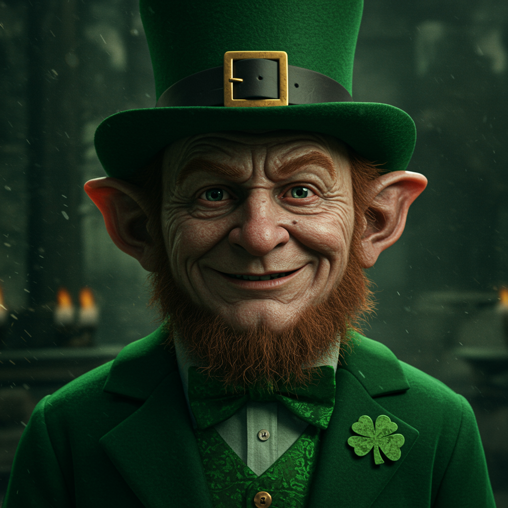 View this AI-generated image featuring a cinematic portrait captures a mischievous leprechaun with intricately wrinkled facial features and a sly grin the scene is awash with prominent shades of green that emphasize his mischievous nature dynamic lighting casts dramatic shadows highlighting his char