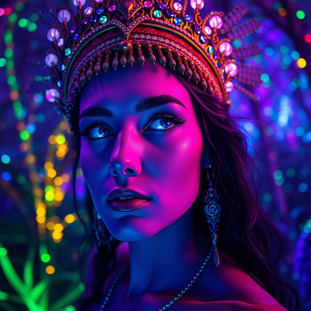 View this AI-generated image featuring a wide angle portrait capturing a dream like woman with mesmerizing eyes gazing into the distance styled in a lavish headdress she exudes a daydreampunk aura with glowing skin and luminescent eyes dripping in vibrant neon hues of blue green and purple the scene