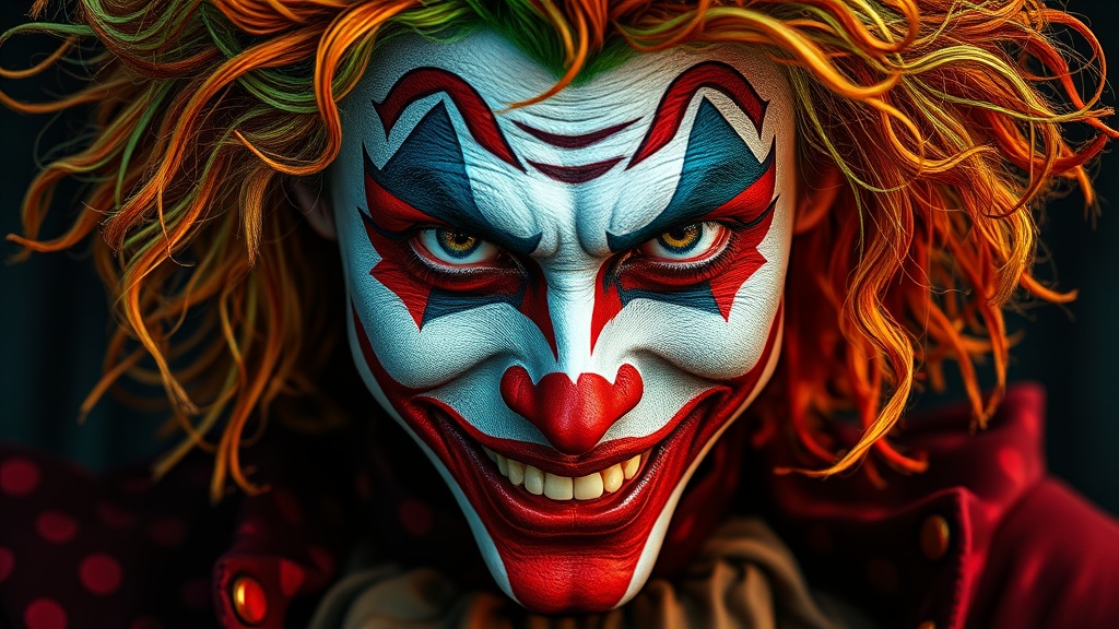 A close-up portrait of a jester character, Caucasian, adult male, with imaginative, dynamic makeup. His eyes are piercing and full of energy, accentuated by a cunning grin. His face is painted with bold reds, vivid oranges, and electric blues, forming a kaleidoscope of chaos. His wild, tangled hair, a blend of vibrant green and golden hues, frames his face like a fiery crown. He dons a richly textured, deep crimson outfit with intricate patterns that intertwine with the vibrant colors of his makeup. Dramatic lighting highlights the makeup details and facial textures, lending an intimate atmosphere to the composition. The image possesses a painterly, graphic quality, with a focus on expressive character and striking color contrasts. The tightly framed composition draws the viewer into a captivating, emotionally resonant scene. The artist masterfully blends color and texture to craft an iconic, unforgettable image. Style: graphic novel, comic artistry, cinematic poster.