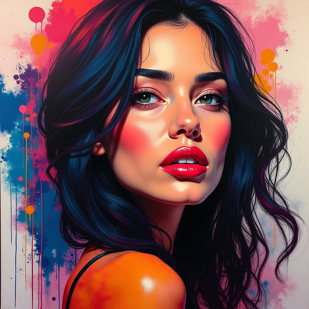 View this AI-generated image featuring a vibrant portrait of a woman crafted with a palette knife showcasing dynamic and bold strokes in heavy impasto style evoking a sense of controlled chaos the elongated 1 2 aspect ratio highlights the dramatic flow of colors and textures influenced by the unique