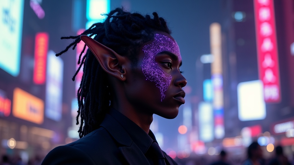 A dynamic portrait of a male elf with dark, richly hued skin and elegantly pointed ears, his hair styled in intricate dreadlocks cascading down his back. He is clad in a sharply tailored, high-tech suit, its sleek fabric shimmering subtly against the neon lights. His face is adorned with intricate, glowing violet biometrics that resemble voodoo paint, giving him an enigmatic presence. The background subtly blurs out to reveal the chaotic and pulsating life of a futuristic cyberpunk city, where flickering holograms and towering skyscrapers paint an evocative, yet dangerous urban landscape.