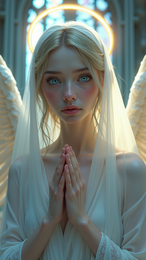 Portrait, epic realism, angel, profoundly melancholic expression, radiant halo, oil painting style, masterful art, azure eyes reminiscent of French painter Alexandre Cabanel, draped in a delicate veil, set against a grand, ancient cathedral. Gentle, ethereal neon lighting. Elements of 3D animation, sketch-like intricacy, subtle cartoon and anime influences. Finely crafted anatomy, graceful form, harmonious lighting, expressive features, serene gaze, graceful hands.