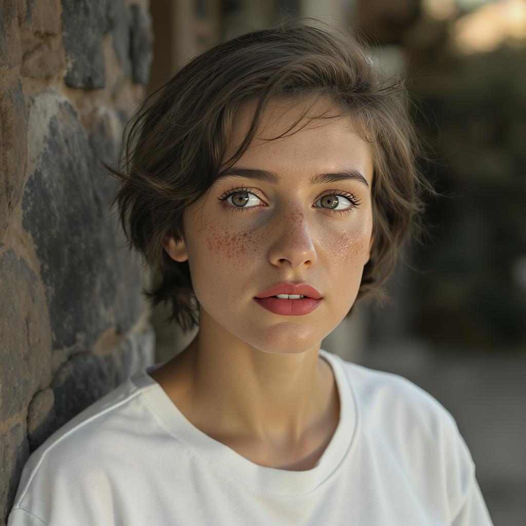 View this AI-generated image featuring a detailed and realistic portrait of a woman with a touch of freckles expressive round eyes and tousled short hair captured outdoors dressed in a simple white t shirt gazing directly at the camera with slightly chapped lips the image features gentle natural lig
