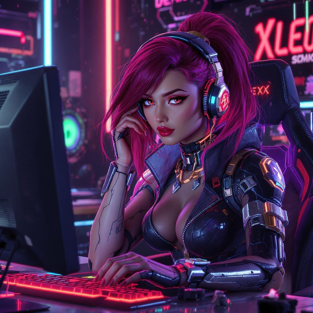 View this AI-generated image featuring a close up portrait of an inspired female cyberpunk biohacker at her desk with a focus on her beautiful face and pretty hands surrounded by a volumetric atmosphere the artwork combines the style of artgerm with vibrant neon colors reminiscent of borderlands it