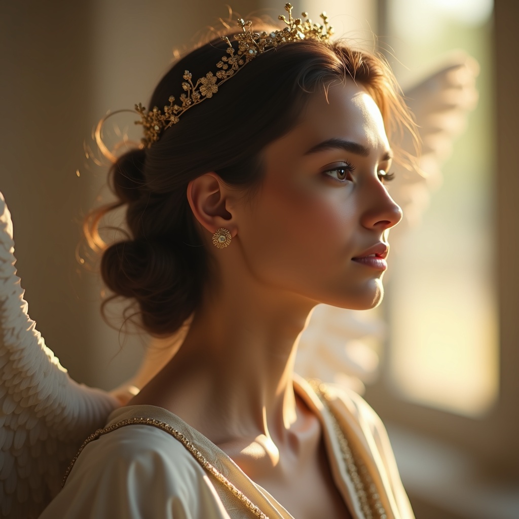 A breathtaking portrait of Angel Gabriel captured in his divine essence, showcasing the intricate detailing of his flawless skin and textures. Dressed in traditional celestial attire, the atmosphere exudes tranquility and profound spirituality. The soft light bathes his form in a gentle, ethereal glow, enhancing the photorealistic quality. Taken with a Sony Alpha 1 camera using an 85mm lens, the photo employs an f/1.4 aperture, a shutter speed of 1/500, and ISO 100, resulting in an 8K UHD image. The color palette features a blend of muted and neutral tones, maintaining a raw and authentic style, capturing the celestial beauty in mesmerizing detail.