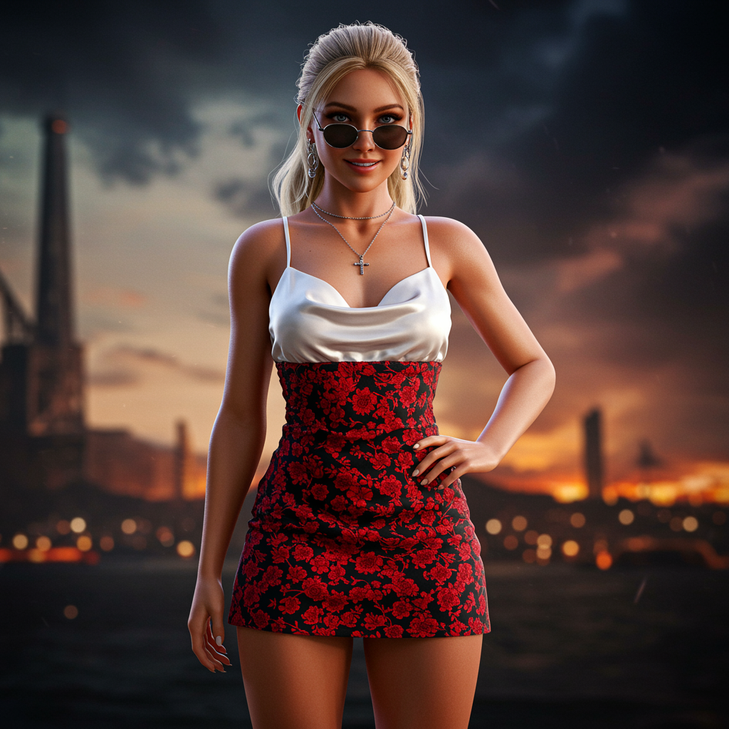 A stunning portrait of a beautiful girl with medium length blonde hair styled in a ponytail, wearing a chic white satin mini dress complemented by black sunglasses. She stands in a confident pose, facing the viewer with a friendly expression. Her face is intricately detailed, embodying the artistic styles of Greg Rutkowski and Magali Villanueve, with perfect proportions and captivating eyes. Her toned physique is showcased in a vibrant red and black flowery mini dress, set against a cinematic backdrop. The full-length frame captures this masterpiece with high-detail RAW color, sharp focus, and hyperrealism, reminiscent of an epic movie poster with intricate details and colorful, dramatic lighting.