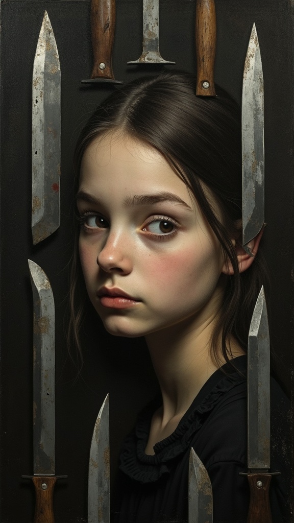 Portrait of a young girl gazing sideways, her eyes eerily empty yet compelling, depicted in an oil painting style. The composition is dominated by the right side of her face, capturing a minimalist avant-garde essence. The texture possesses a grainy quality, with rich details echoing the style of Diego Velazquez. Surrounding her are numerous knives, adding an edgy, rough element to the scene. The artwork's overall narrative is mysterious and intense, with a tall canvas emphasizing the vertical composition.