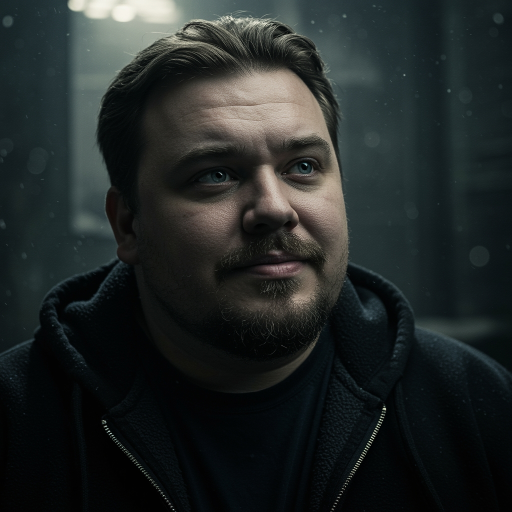Portrait of a stunningly handsome 30-year-old man with an overweight build and a striking face, characterized by a curious and friendly expression and a tidy goatee. His hair complements the style. The background features an oppressive and contrasting atmosphere with dramatic backlighting, creating a gloomy, horror-inspired scene. It's a cinematic shot from a low angle using a DSLR, designed with an aperture of f/7, a shutter speed of 1/100 sec, and ISO 150. The image is super detailed and hyper photorealistic, with natural reflections and cinematic lighting. Despite a dynamic and dramatic setting, avoid any unrealistic features such as deformed anatomy or duplicated elements to maintain realism and coherence.