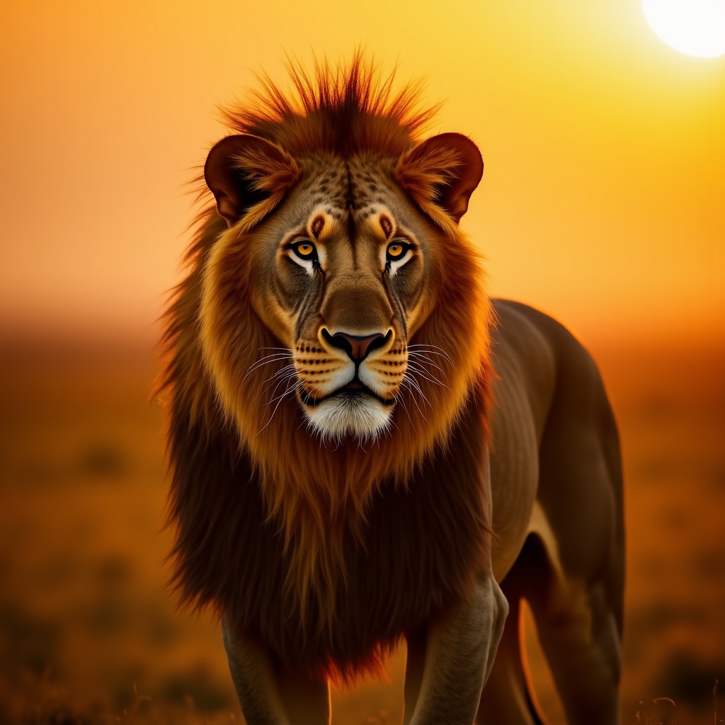 A breathtaking portrait of a majestic male lion basking in the warm glow of the African savannah's golden hour. This magnificent predator exudes a commanding presence, his piercing amber eyes scanning the horizon with a fearless intensity. His regal mane surrounds his face like a halo, with rich, tawny tones that catch the setting sun, enhancing his nobility. His well-defined muscles are poised with latent energy, and his sleek coat shimmers under the caressing rays of the sun. Captured with a Canon EOS-1D X Mark II DSLR camera paired with a 300mm f/2.8L IS II USM lens, the photograph boasts a 20.2-megapixel resolution and an ISO setting of 800, meticulously detailing the lion's majestic features. The camera's aperture priority mode with an f/2.8 aperture created a stunning shallow depth of field, with a beautifully soft bokeh backdrop. A shutter speed of 1/1000 sec captured the lion's movements seamlessly. To enhance the vibrancy of the scene, a circular polarizing filter was employed, subtly enriching the colors of the sky and surrounding landscape. Post-processing in Adobe Lightroom and Photoshop focused on color grading and contrast refinement to bring out the lion's natural grandeur while ensuring each element was rendered in hyper-realistic detail. This result is a captivating, ultrahigh-definition portrait that channels the robust spirit and formidable presence of Africa's iconic predator, designed to leave an indelible impression with its dramatic visuals, creating a timeless piece.