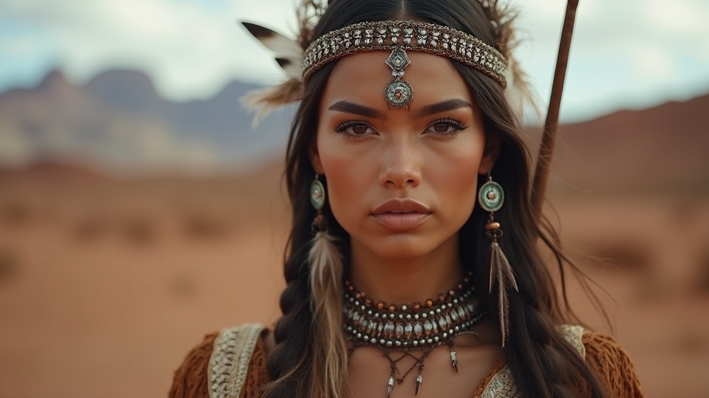 View this AI-generated image featuring portrait photograph of a young beautiful native american woman inspired by madison beer as pocahontas featuring a perfect symmetrical face adorned with intricate feather jewelry and traditional handmade dress embodying the spirit of an armed female hunter warri