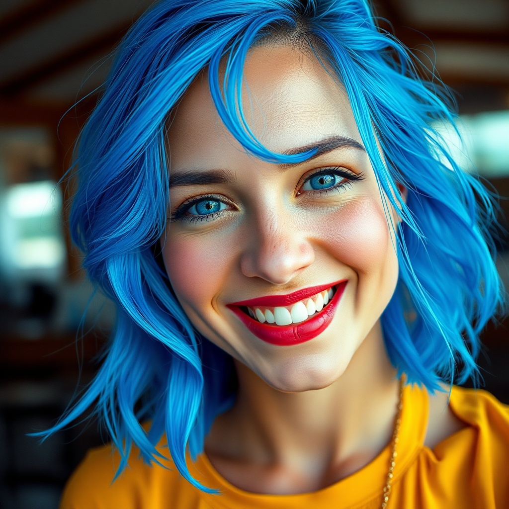 View this AI-generated image featuring a vibrant portrait of a captivating woman with striking blue hair and warm smile styled like a dynamic animated gif capturing candid fleeting moments shot with the essence of provia film reminiscent of the art by inessa garmash and natalia rak showcasing intric