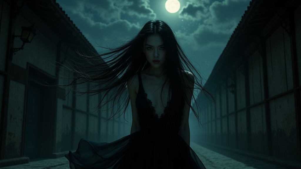 A captivating portrait of a vampire woman in a Victorian back alley, locking eyes with the viewer as she leans in to bite. Her long, messy hair blows dramatically in the wind, enhancing the eerie ambiance. Jewel-like eyes glimmer in the dim alley, where dust particles float in the detailed, dramatic lighting. The scene is illuminated by rim lighting, accentuating the dark, mysterious atmosphere. Above, the night sky is adorned with stars and dark clouds, dominated by a full moon. The vampire wears a flowing black dress that complements the dark setting. This image draws inspiration from the styles of John Constable, Ed Blinkey, Atey Ghailan, Jeremy Mann, Greg Manchess, and Antonio Moro, while showcasing high-detail and intricate artistry. The artwork is reminiscent of trending pieces on ArtStation and CGSociety, capturing the viewer's imagination with its striking portrayal. The setting is styled with an Asian influence, yet remains timeless with its gothic allure.