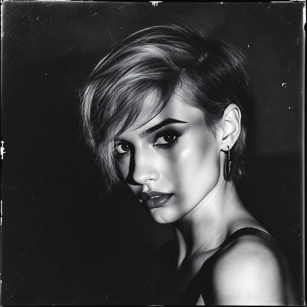A striking portrait of a young woman with a chic haircut and intense gaze. The photograph is captured in a high-contrast style that plays with bold shadows and bright highlights, accentuating the model's angular features. Taken with a vintage film camera and a fast prime lens, the image exudes a gritty, authentic feel. This portrait is ideal for fashion editorials, advertising campaigns, or as captivating wall art.