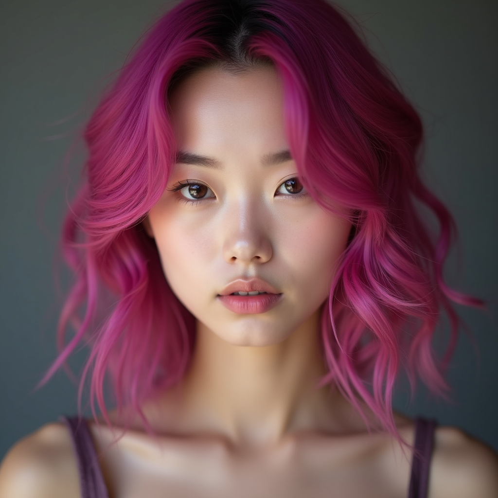 View this AI-generated image featuring portrait of an elegant young woman with vibrant magenta pink hair subtle film grain effect captured in high definition studio setting nikon d850 camera asian descent chinese heritage. Created using advanced AI technology, this image showcases character art, vib