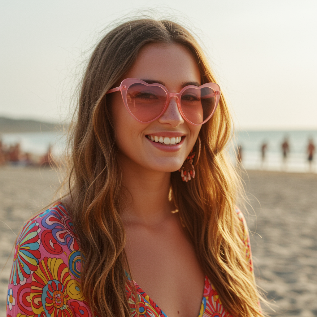 A half-body portrait of a free-spirited young woman with a slender frame, adorned in oversized, heart-shaped pink sunglasses with a warm rose tint. She wears a vibrant, kaleidoscope-patterned top with a daring plunging neckline. Her attire is a colorful homage to the 1960s beach scene bustling around her, where the sun casts a golden hue on the sand and the air is filled with the sounds of laughter and surf. Her carefree smile and the playful swing in her long, wavy hair capture the essence of the era's spirit.