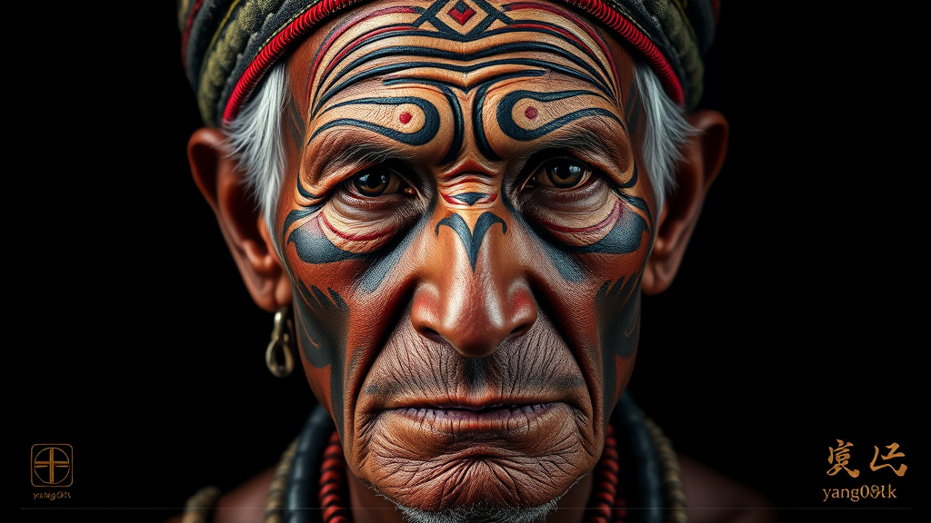 A striking portrayal of a tribal elder with intricate facial tattoos, captured in a yang08k-inspired photography style against a deep black background. The vivid colors and realistic details bring out the beauty and dignity of the subject, creating a masterpiece that resonates with both official art standards and aesthetic appeal. The composition is enhanced by subtle collage elements and a hint of the artist's personal signature and logo, adding a unique touch to this top-quality artwork.