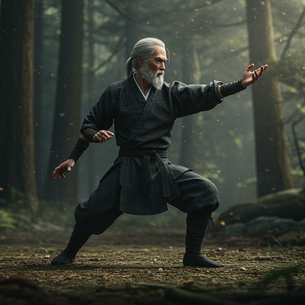 A realistic portrayal of an elderly Japanese man gracefully engaged in martial arts amidst a stunning outdoor forest setting, intricately detailed and framed according to the rule of thirds with a golden ratio. The scene exudes cinematic quality, reminiscent of a concept character masterpiece, merging the classical style of Da Vinci with the dramatic flair of Greg Rutowski. The lighting is dramatic, adding depth and emotion to the composition, which echoes the style of a classical oil painting. Despite the complexity, the image maintains a harmonious balance, subtly echoing the experimental imperfections of contemporary art influences.
