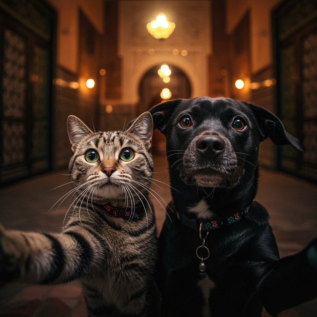 A cat and dog pose for a selfie in the heart of Marrakech, Morocco, where detail reigns supreme. The scene is beautifully intricate, balancing elegance and sharp focus with symmetry and masterful composition. Dramatic ambient light casts a cinematic glow, enhancing the vivid colors that tell stories of their own. The image exudes a professional touch, capturing moments of brilliance and coherence amidst a luxurious atmosphere. Enveloped in an inspiring, futuristic aura, the animals bask in a shiny, epic glow that illuminates their companionship, creating a fantastic and thought-provoking portrait—perfectly atmospheric, vivid, and engaging.