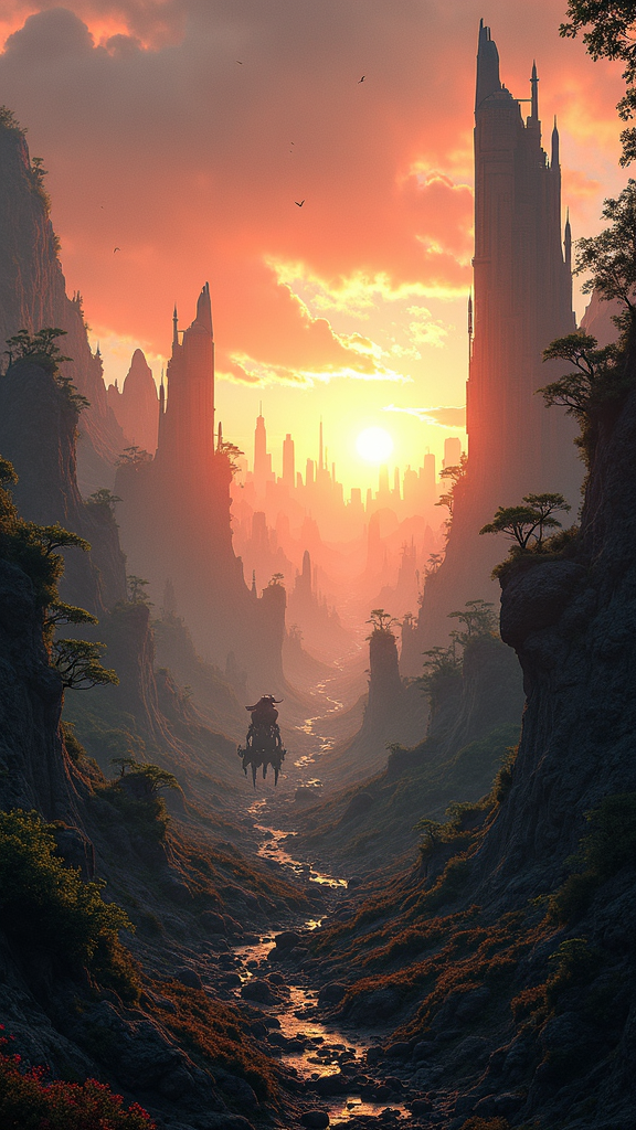 A vast post-apocalyptic cityscape unfolds, remnants of skyscrapers and ancient technology entwined with lush, untamed nature, drawing inspiration from the horizon zero dawn universe. The scene is enveloped in dramatic lighting, casting long shadows across the landscape as the sun dips below the horizon. In the distance, mysterious mechanical creatures roam amidst the ruins. The artwork captures a sense of awe and wonder, rendered in a style reminiscent of final fantasy ink art, showcasing intricate details and sweeping vistas. The atmosphere is both haunting and beautiful, with every element contributing to an 8k resolution masterpiece, revealing a world where nature and remnants of a technological past coexist in harmony and tension.