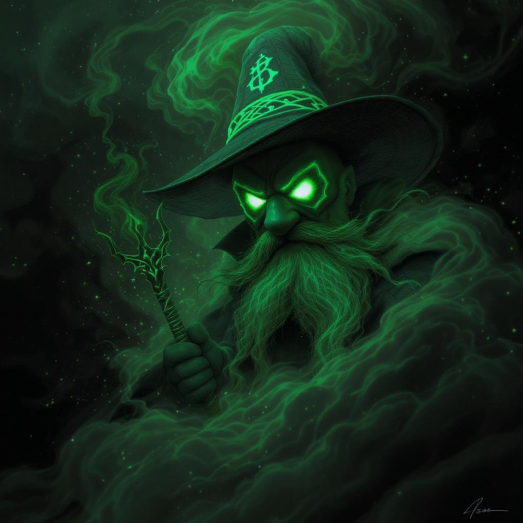 Psychic-Origin Wizard Deadpool enveloped in a swirling dark mist, rendered in a glimmering, hyper-realistic caricature style reminiscent of Craig McCracken, characterized by polygonal forms and a vibrant green monochrome palette, with subtle creative flourishes in design that retain the essence of the original concept.