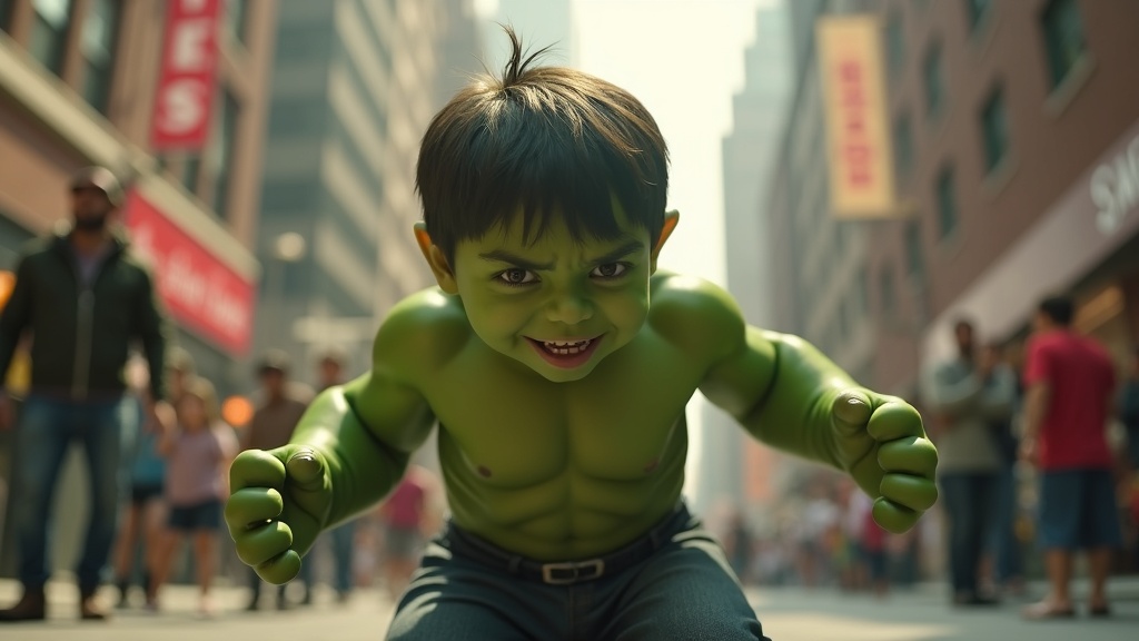 Realistic cinematic scene featuring a toddler-sized Hulk, with vivid green skin and expressive eyes, showcasing immense strength in a bustling city environment, surrounded by astonished onlookers and dramatic lighting.