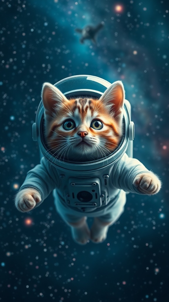 View this AI-generated image featuring realistic image of an adorable cat in a space suit floating in a starry galaxy with an ultra high definition quality showcasing crisp 8k details and vibrant cosmic colors. Created using advanced AI technology, this image showcases science fiction, photorealisti