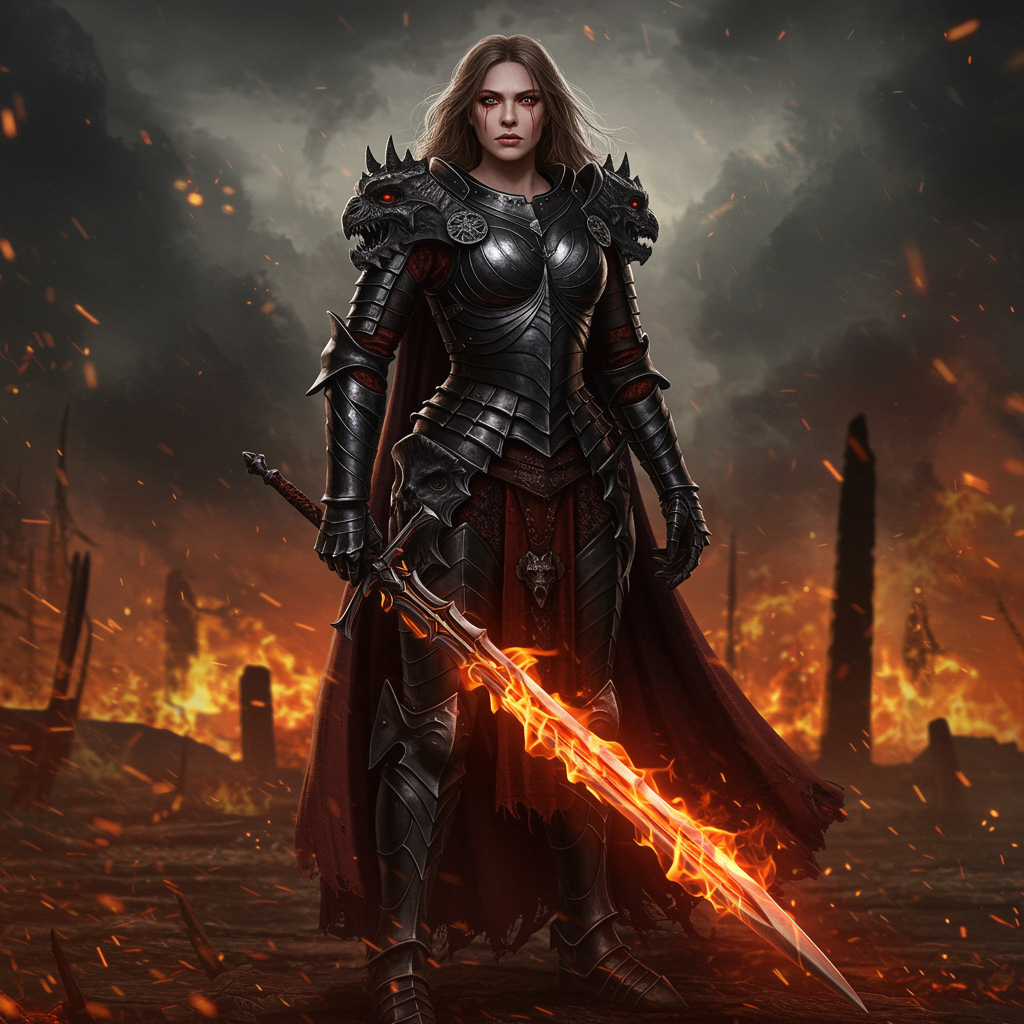 A highly realistic woman clad in intimidating black armor, wielding a fiery sword with a human visage and flowing long hair, exuding power and mystery. Her armor resembles dragon scales with intricate designs, perfectly capturing every nuance. Her face is incredibly detailed, exhibiting super sharp focus and a lifelike quality, revealing high details and a mesmerizing expression. The character stands regally, her full body rendered in super detailed 32k resolution, set against an epic background brimming with fire and ash, evoking a sense of horror. She strikes an impressive pose, with an atmosphere that resonates powerfully, providing a spellbinding visual in high resolution, its dramatic elements enhanced by the epic scene surrounding her.