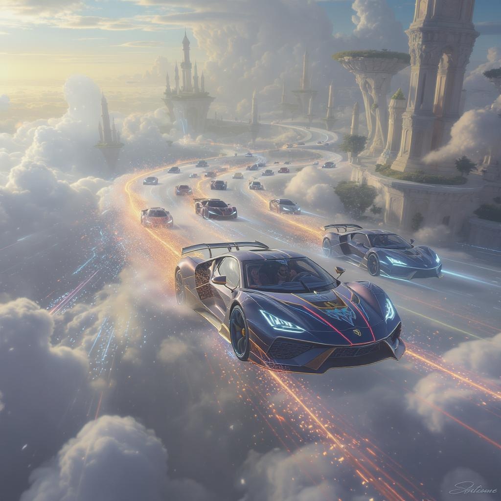 View this AI-generated image featuring in a mystical realm where the sky is the ultimate racetrack elegant fantasy sports cars speed across the clouds fueled by enchanting energies that defy gravity each vehicle crafted with intricate designs and magical materials roars with a vibrant spirit reminis