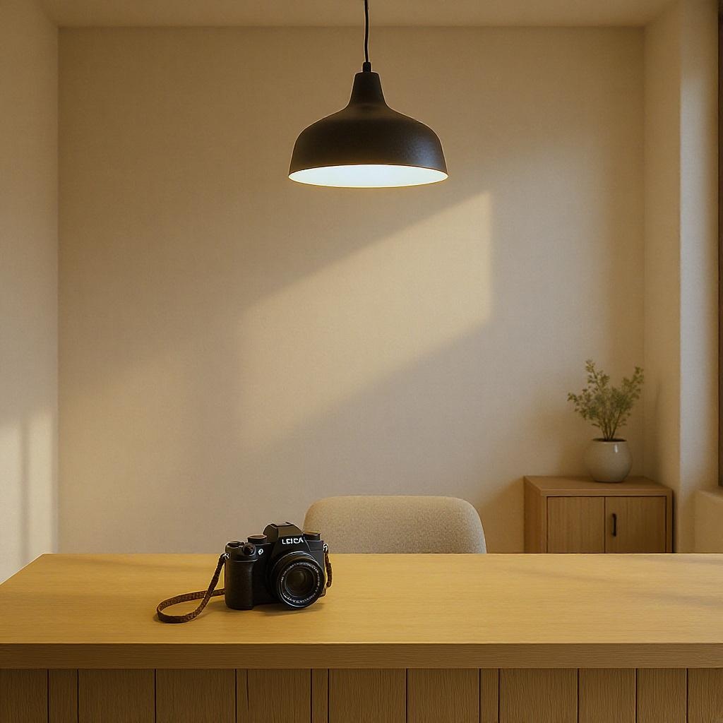 View this AI-generated image featuring a serene and welcoming reception area featuring a minimalist design with a leica sl2 camera casually placed on the desk enhanced by a stylish pendant light casting a gentle illumination that blends seamlessly with the soft glow of indirect lighting all bathed i