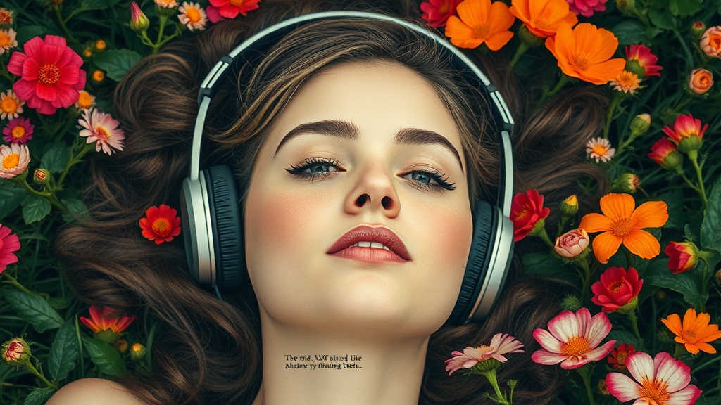 View this AI-generated image featuring a woman reclines in a lush field of vibrant flowers her head adorned with headphones her face is captured with remarkable detail and symmetry exuding a realistic and cinematic quality the scene is highly detailed yet presented in a low resolution style elements