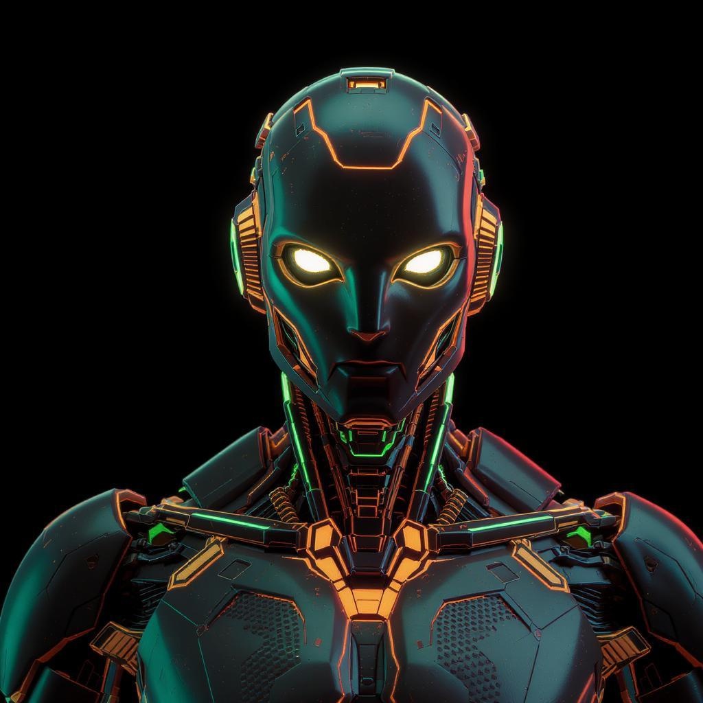 View this AI-generated image featuring a hyper realistic 3d rendering of a robot showcasing the upper body from the front adorned with neon hues of deep orange and emerald green that illuminate its complex features its eyes glisten strikingly capturing a captivating gaze all set against a stark blac