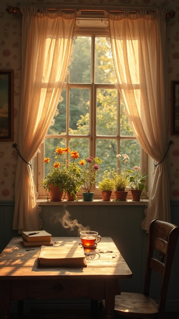 In an old room bathed in the soft glow of the golden hour, a wooden table and chair set the scene. Textbooks and a well-worn notebook lay open, accompanied by a vintage pen just moments from dispensing ink. Through an opened window, delicate tulle curtains catch a gentle breeze, revealing glimpses of a lush forest bathed in the warm hues of sunset. A glass cup sits nearby, filled with steaming hot herbal tea, its swirling steam mingling with the fragrance of potted flowers on the window sill. Sun rays filter through, creating a tapestry of light that dances across a faded watercolor painting hanging on the wall, capturing a timeless moment from the 1800s.