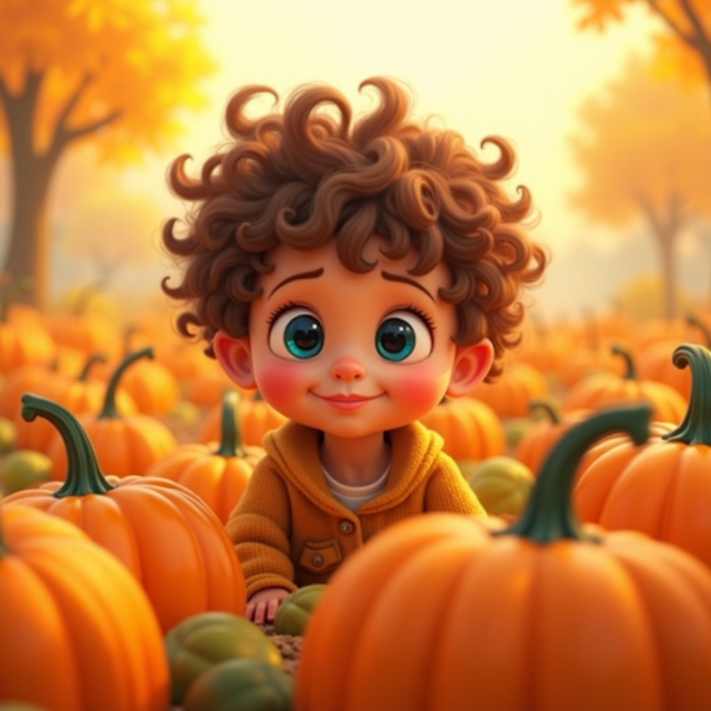 A whimsical scene in a 3D animated style featuring an adorable little girl with tousled chestnut curly hair, exploring a vibrant pumpkin patch. Her enchanting, large sapphire-blue eyes capture the essence of wonder and curiosity as she gazes upon the autumn landscape. Her cherubic face is detailed and expressive, embodying pure innocence and delight. Sunlight filters through the golden leaves, casting a warm glow over the array of pumpkins of all shapes and sizes. The scene is rendered with striking realism and vivid autumn hues, akin to a Pixar film, capturing the essence of joy and the spirit of the season.