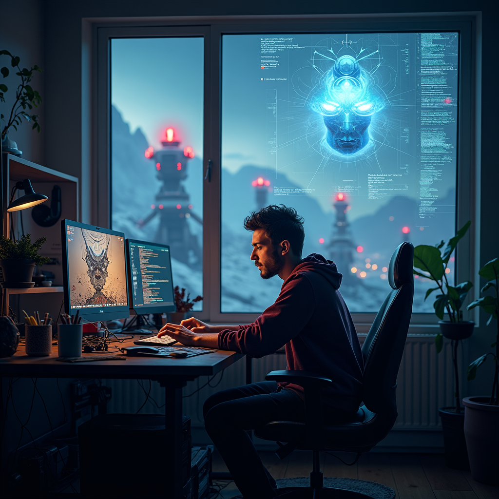 In a high-definition, 8K scene inspired by Stalenhag, Kaleb sits engrossed at his cluttered desk, coding fervently on his sleek computer. The dim glow of multiple screens casts a futuristic ambiance around the room, reflecting off metallic surfaces and scattered electronic components. Outside the windows, a vast, otherworldly landscape stretches into the horizon, featuring towering, monolithic machines quietly humming. Kaleb’s face is illuminated with determination and creativity as he develops an innovative and engaging Discord bot, merging the digital realm with the fantastical elements of his environment. A holographic projection of code and digital schematics hovers near his workspace, intertwined with artistic blueprints of imaginative robotic designs, showcasing the fusion of his creative and technical prowess.