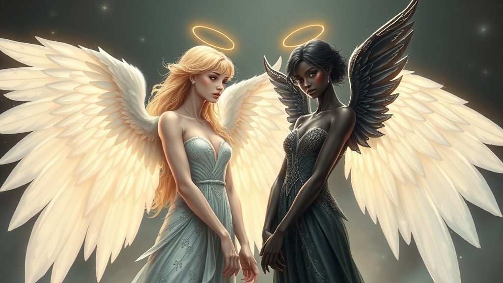 An enchanting scene with one radiant blond Caucasian angel with luminous white wings and a stunning black angel with shimmering dark wings, standing together in mutual harmony. Both angels exhibit intricate, detailed craftsmanship, capturing their elegance in a full-body portrayal. The artwork maintains a 2D style, with subtle creative modifications to enhance the depiction. Note: The original artwork may exhibit a range of visual artifacts and imperfections, including text logos, watermarks, signatures, off-frame elements, and jpeg artifacts. There may also be anatomical deviations, such as extra or misplaced limbs, incorrect anatomy, or unusual body positions, alongside features like mismatched or misaligned eyes, unclear elements, and poor composition aspects. The scene embraces an imaginative and unconventional aesthetic, which adds a unique charm.