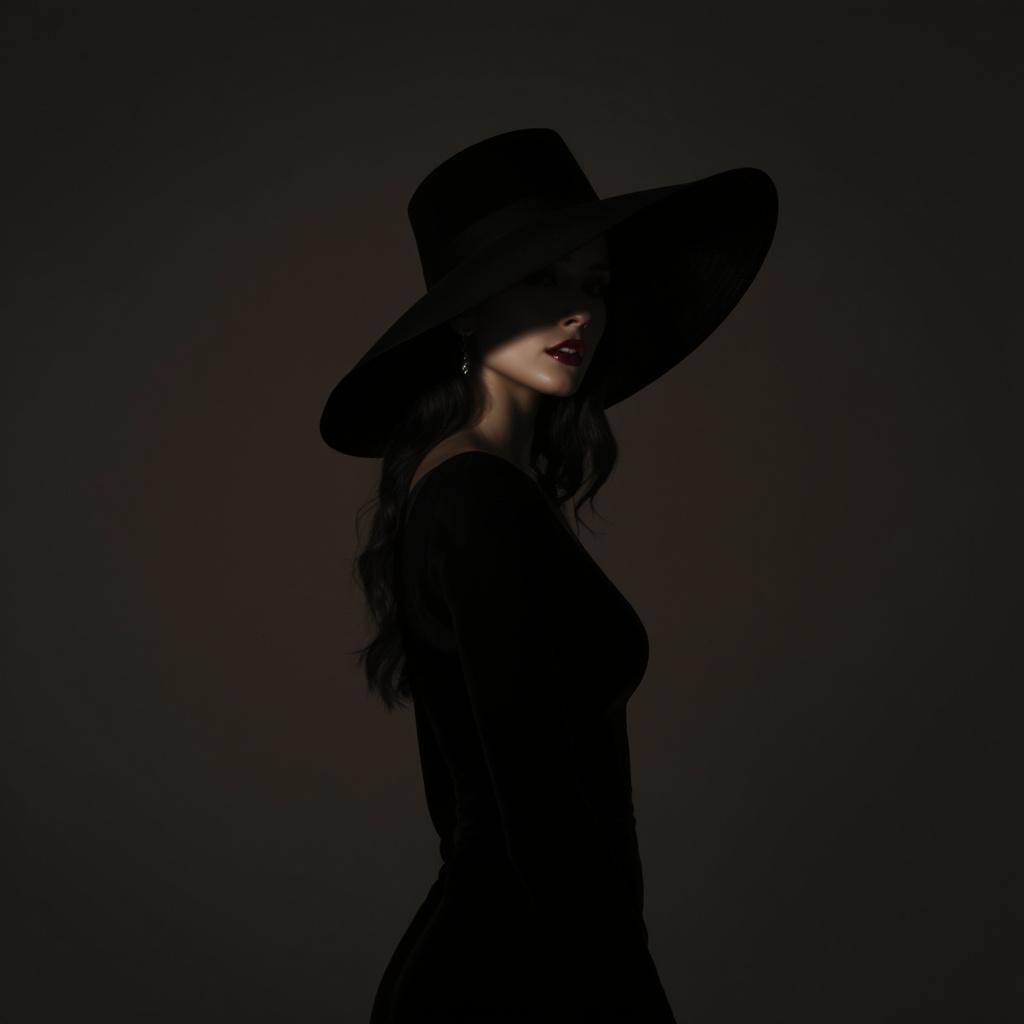 A stunning scene where a woman in an elegant black dress stands gracefully, her large hat tilted to the right, seamlessly blending with the clever use of negative space. The interplay of light and shadow accentuates her silhouette, revealing crisp lines and intriguing forms. The composition is dark yet intricate, capturing a striking balance between elegance and artistry.