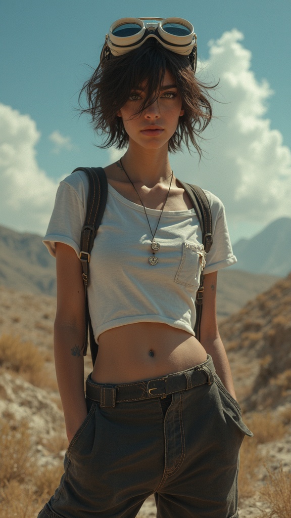 View this AI-generated image featuring a dreamscape scene featuring a stunning young individual slim and athletic with short tousled hair intricate details adorn their appearance enhanced by the fashion of baggy pants and a stylish t shirt they accessorize with goggles and a cap revealing a midriff