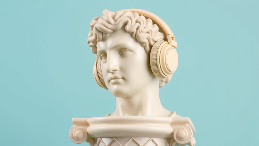View this AI-generated image featuring sculpted bust of apollo wearing cream vintage headphones resting on a corinthian column set against a pastel blue background. Created using advanced AI technology, this image showcases creative visuals, AI artwork. Perfect for wallpapers.