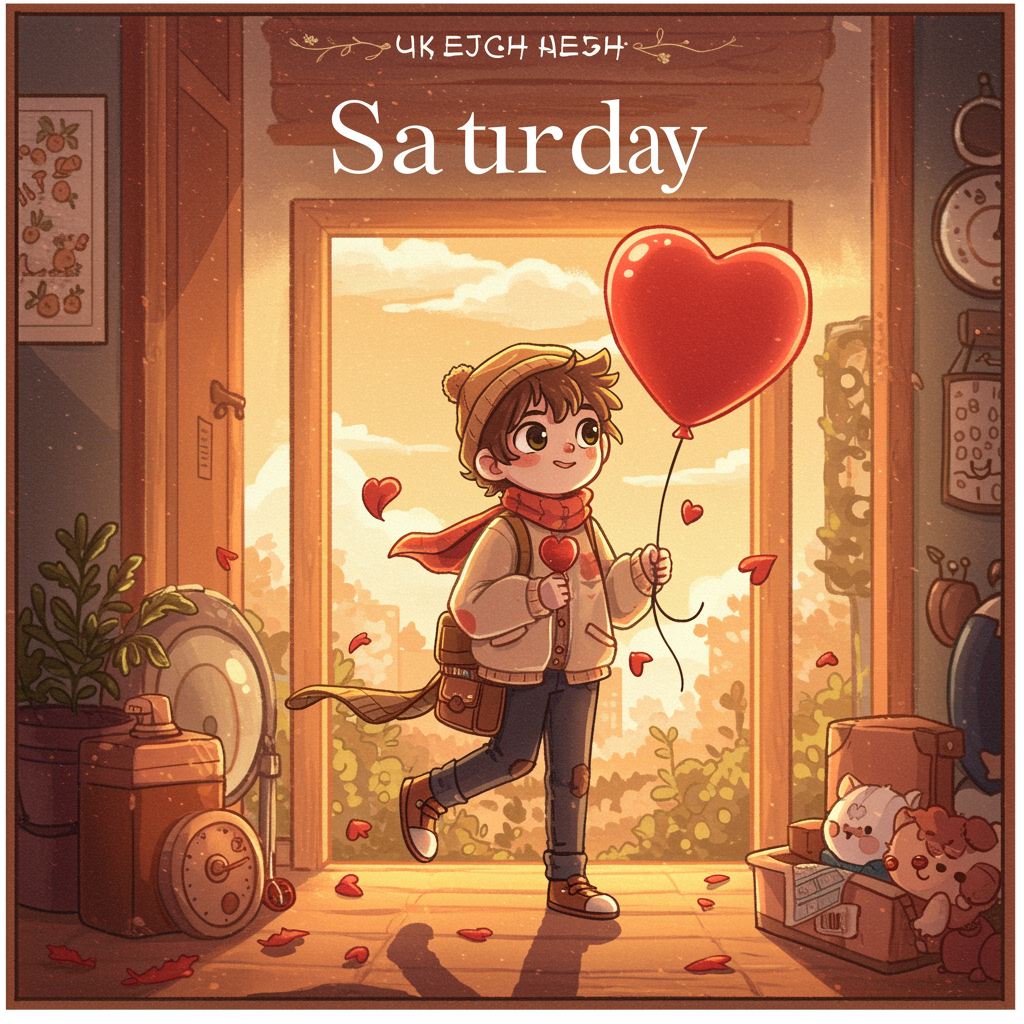 A poster showcases a young boy clutching a heart-shaped balloon, designed in the enchanting style of sketchfab, infused with poodlepunk elements and enveloped in warm, cozy tones. It's Saturday, and the scene is reminiscent of screenshots, capturing romanticized figures within expressive comic panels. The atmosphere is steeped in romantic academia, rendered in stunning HDR quality. The boy strikes a dynamic pose, every detail in sharp focus, as the illustration blossoms in 32k clarity, radiating whimsy and emotion.