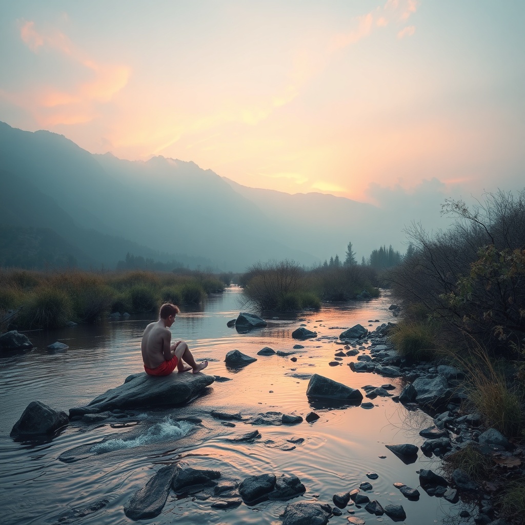 Sitting by the stream, the gentle flow whispers in silence. The mind finds peace, a stillness woven with the breath of the wild. Calm, dreamy moments linger by the clear water. Surreal colors blend in an 8K vision, where nature's art forms intertwine. Amidst hints of abstraction, the essence of serenity resonates. Here, imagination wanders, sketching unseen rhythms that dance with light and shadow. The tranquil landscape invites a timeless pause, embracing imperfection with graceful beauty.