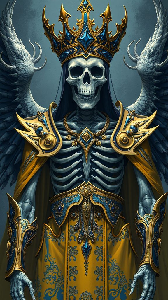 View this AI-generated image featuring skeleton king of the underworld outfitted in elaborately crafted nordic armor digital illustration scenic and hyper realistic a fusion of elegance and detail adorned in majestic shades of royal yellow and ultramarine blue in the stylistic veins of artgerm wlop